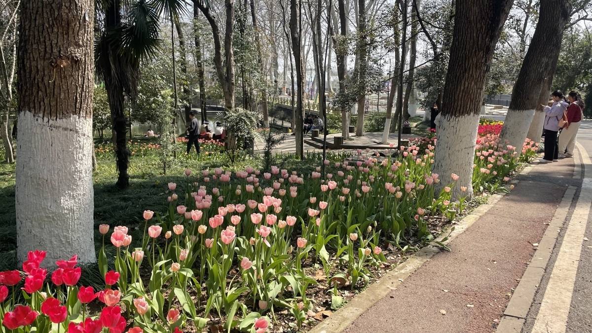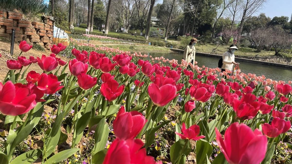 本年,武汉植物园共展出郁金香、风信子、洋水仙等球根花草50万余株,涵盖近百个品种。