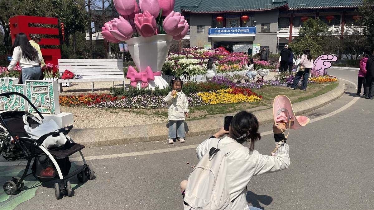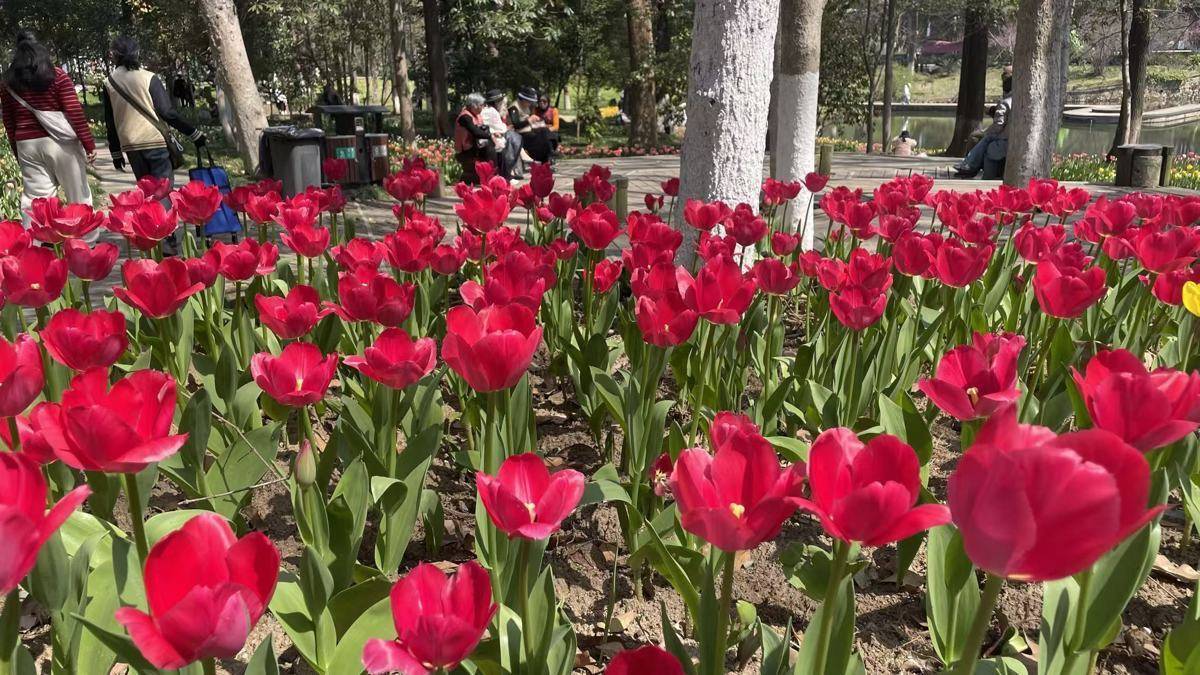 展区内还配置风车、画框、泡泡机等景不雅安装,简单搭客打卡拍摄。相邻的绿野花田区域,在出路连合栽植了红、粉、紫、橙等暖色系郁金香。