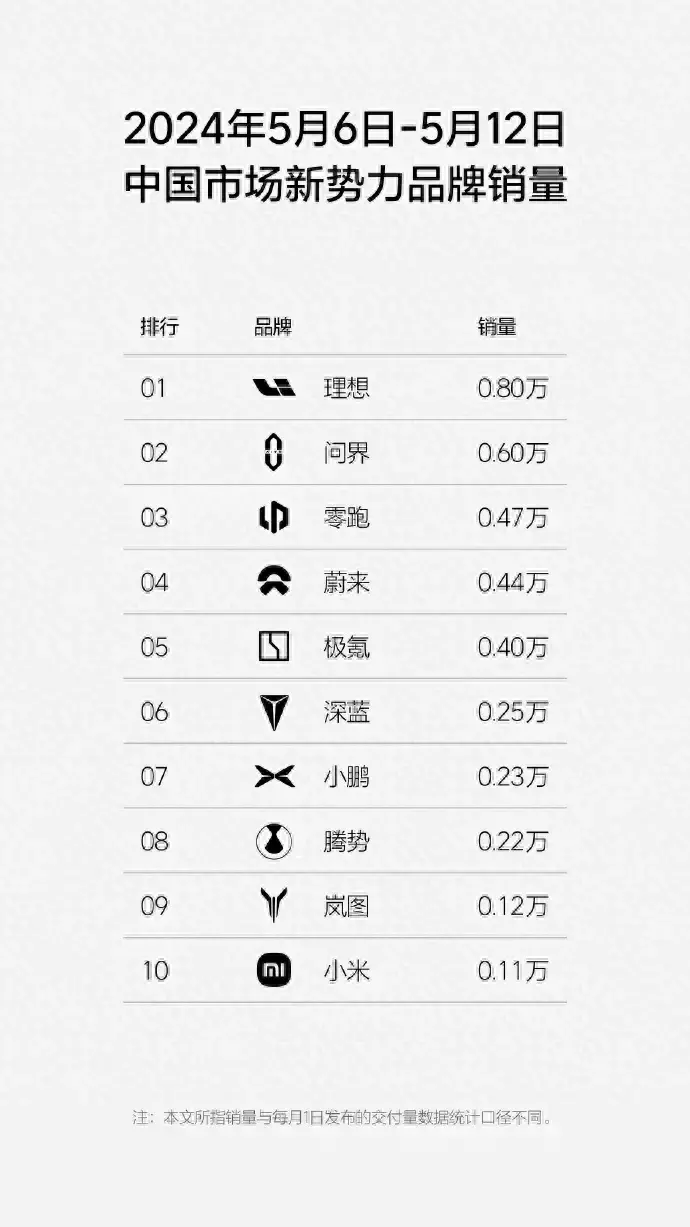 5月14日,理念念汽车再发5月6日-5月12日周销量榜单: