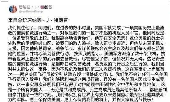 2名遨游员先后被到手救回,特朗普幸免遭受最大危急,对伊朗的干戈还将络续。