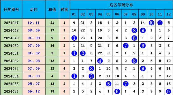 上期后区开出冷冷组合号码06 12,本期后区保举热码03和重号12。
